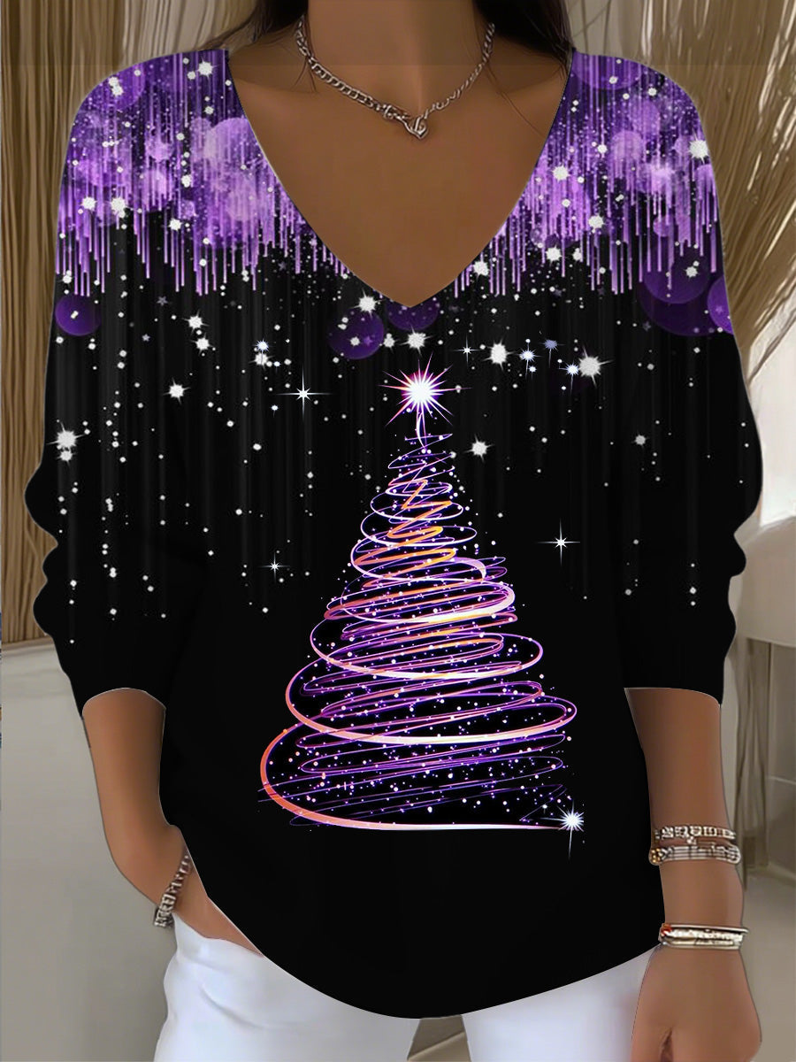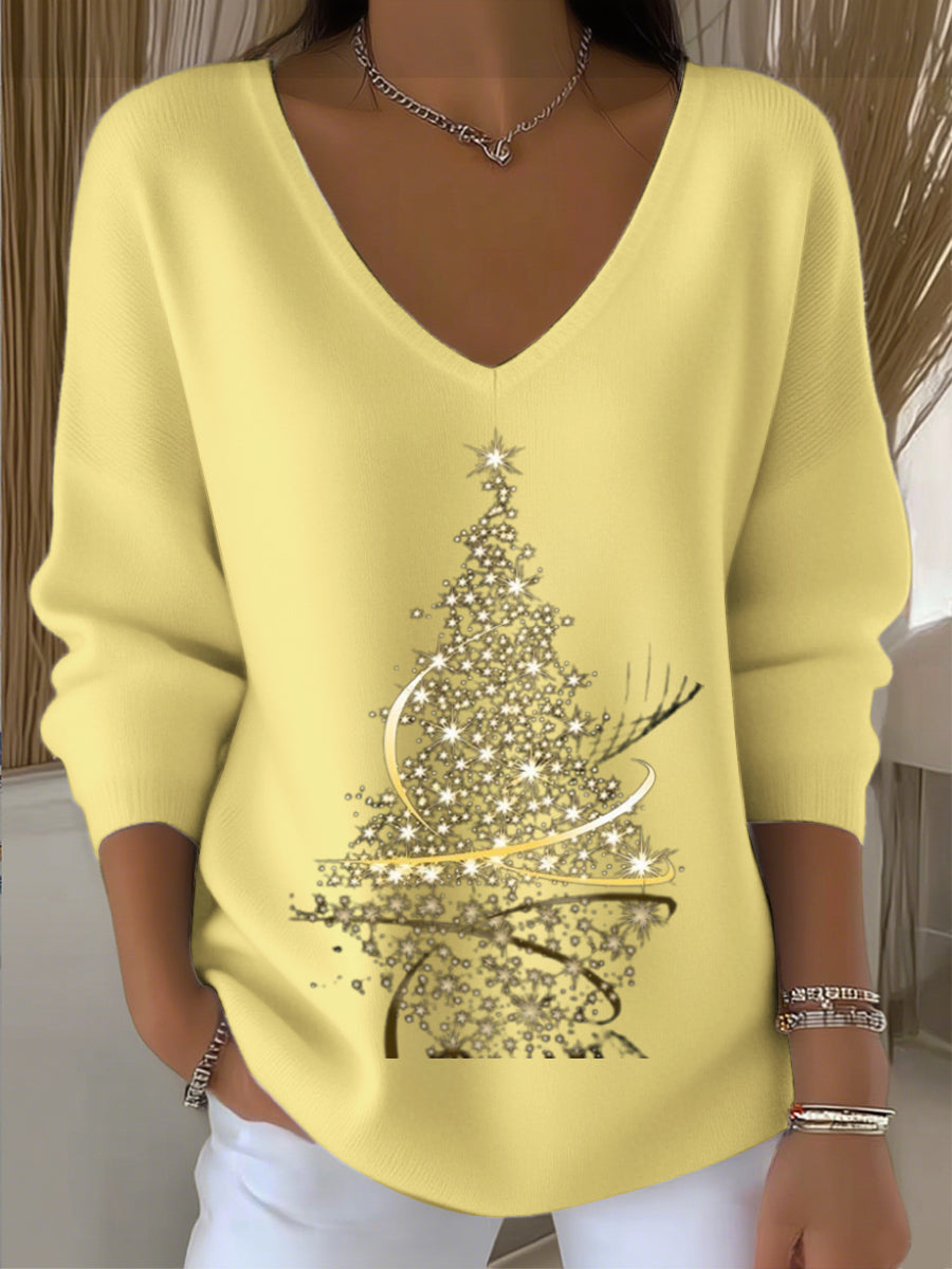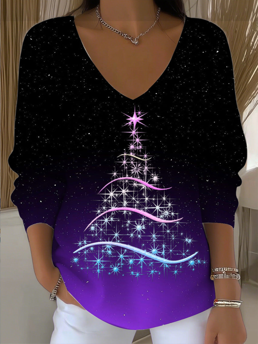 Дамски блестящ градиент коледно дърво v-врата пуловер